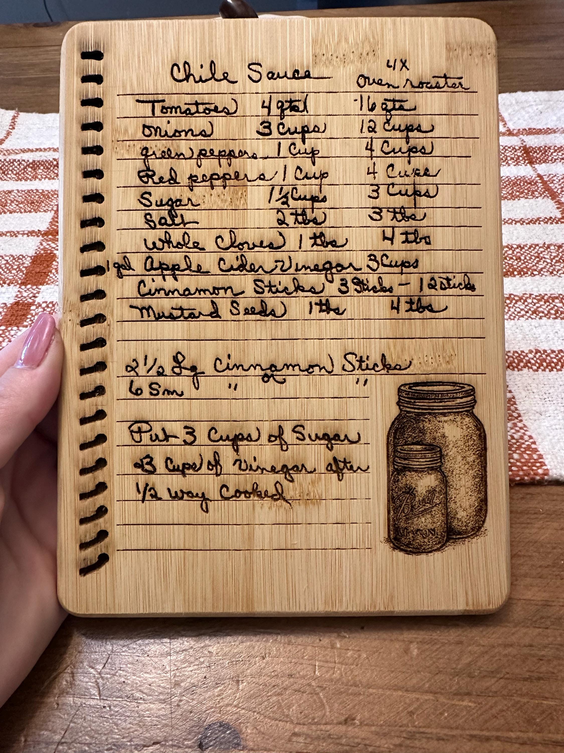 Personalize your cutting board with a treasured handwritten recipe! Display and preserve your handwritten recipes from your Grandma, Mother, Aunt, Sister, Friend, Etc. by having them burned into a fully functional cutting board! Makes a fantastic gift for a wedding, housewarming, birthday or any holiday! Recipes will be put on board "as is", unless discussed otherwise. I will always remove wrinkles, rips in the paper and stains- unless requested otherwise.
