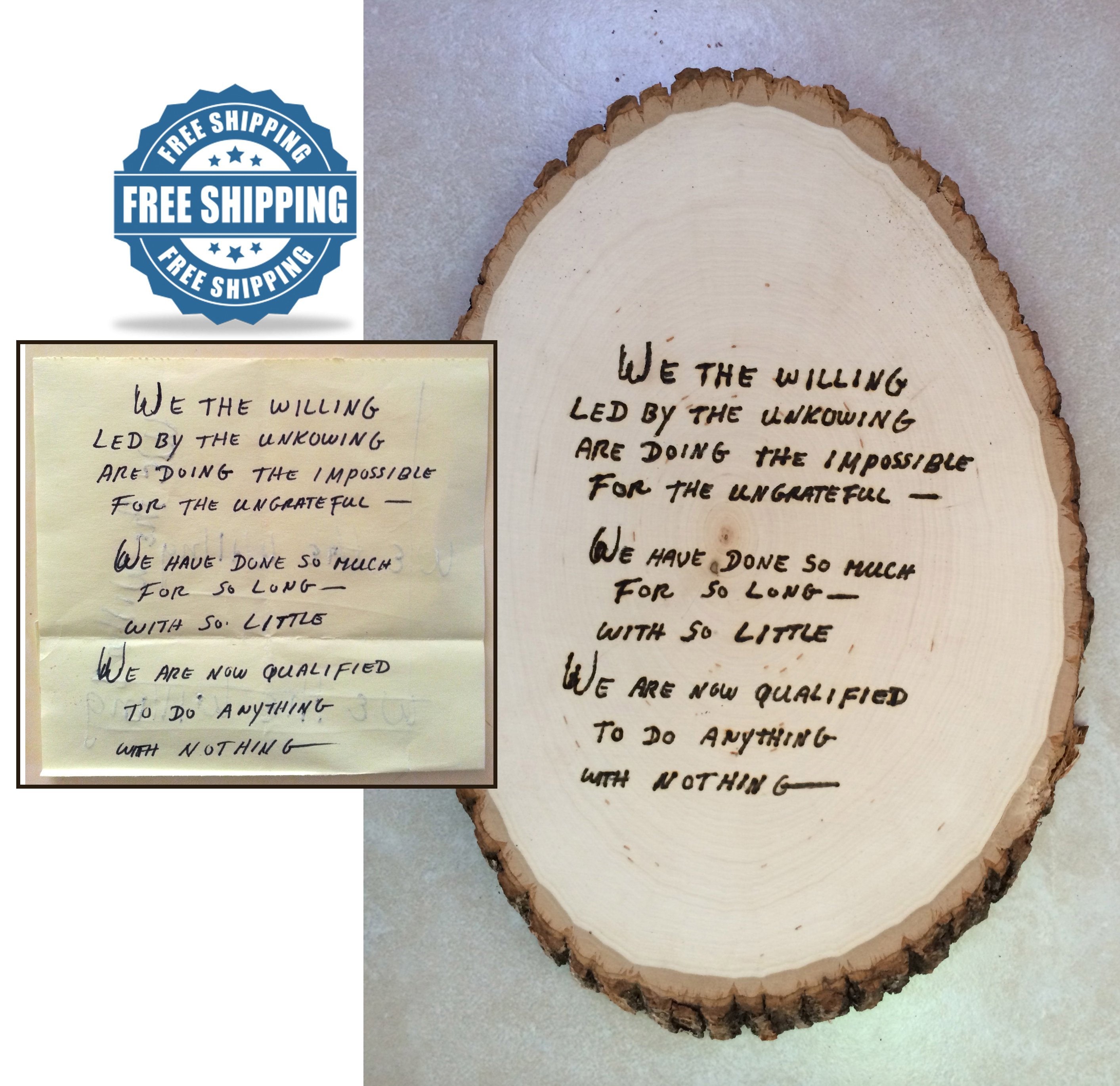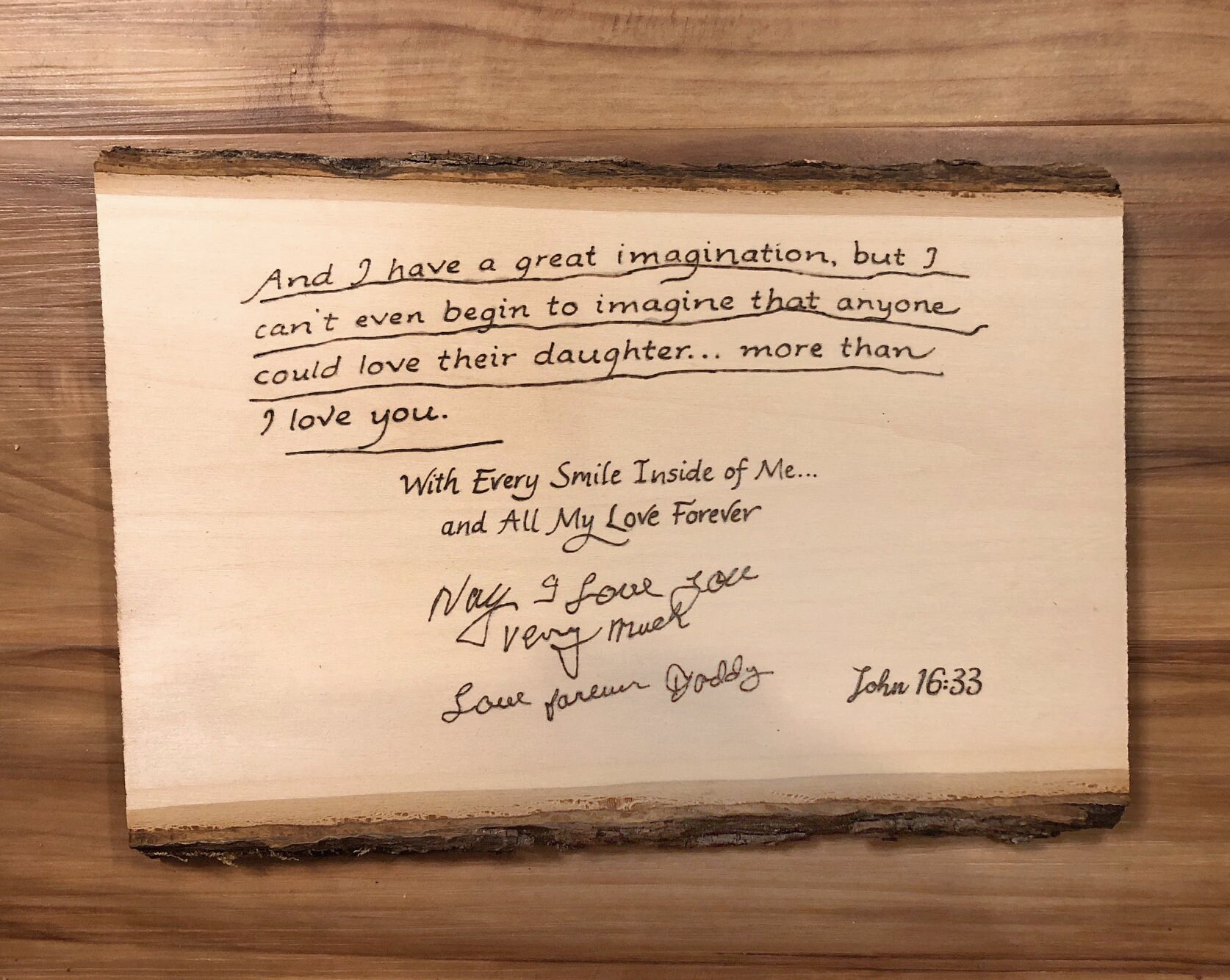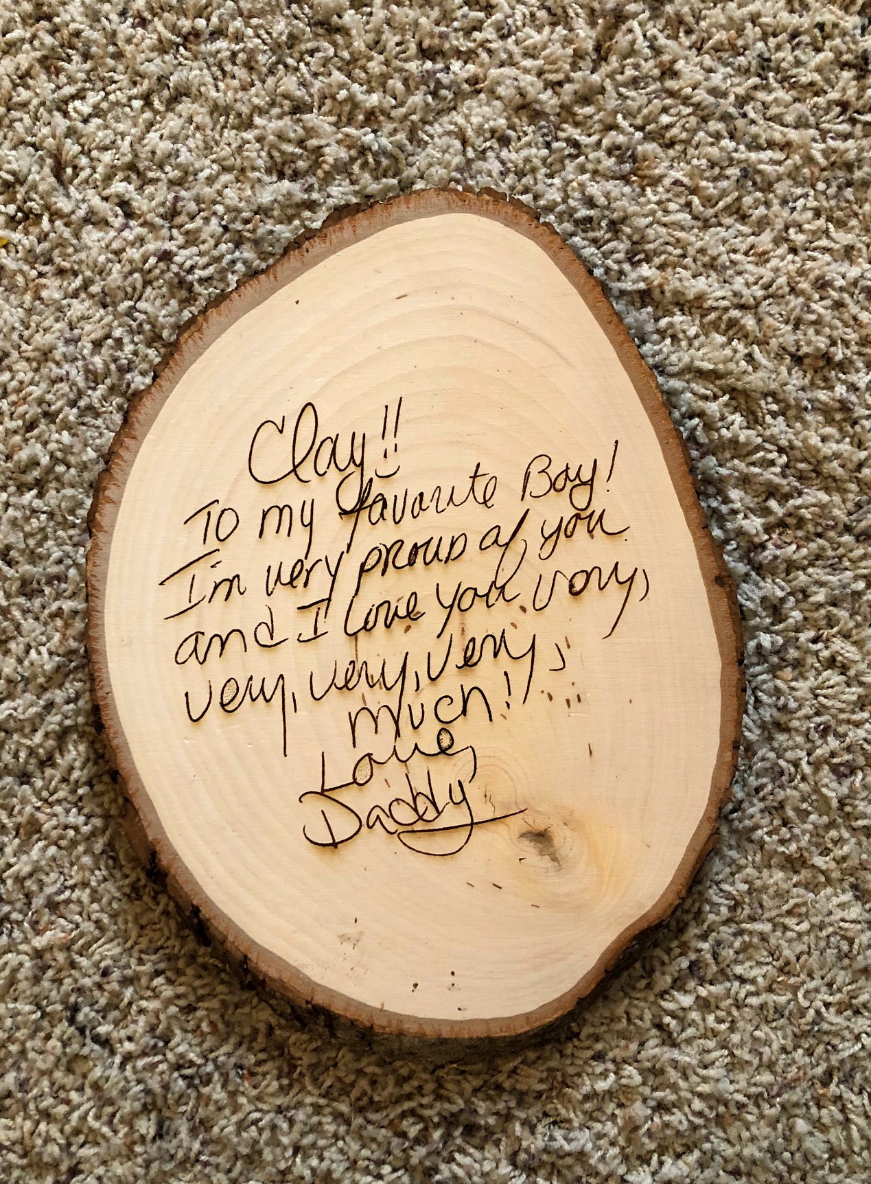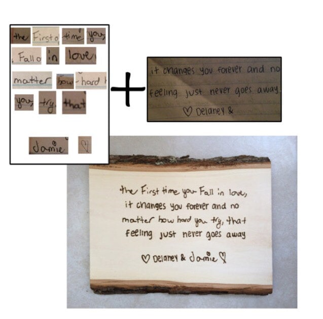 Send me a digital file of the note or letter and I will burn the letter into the wood in the exact handwriting!