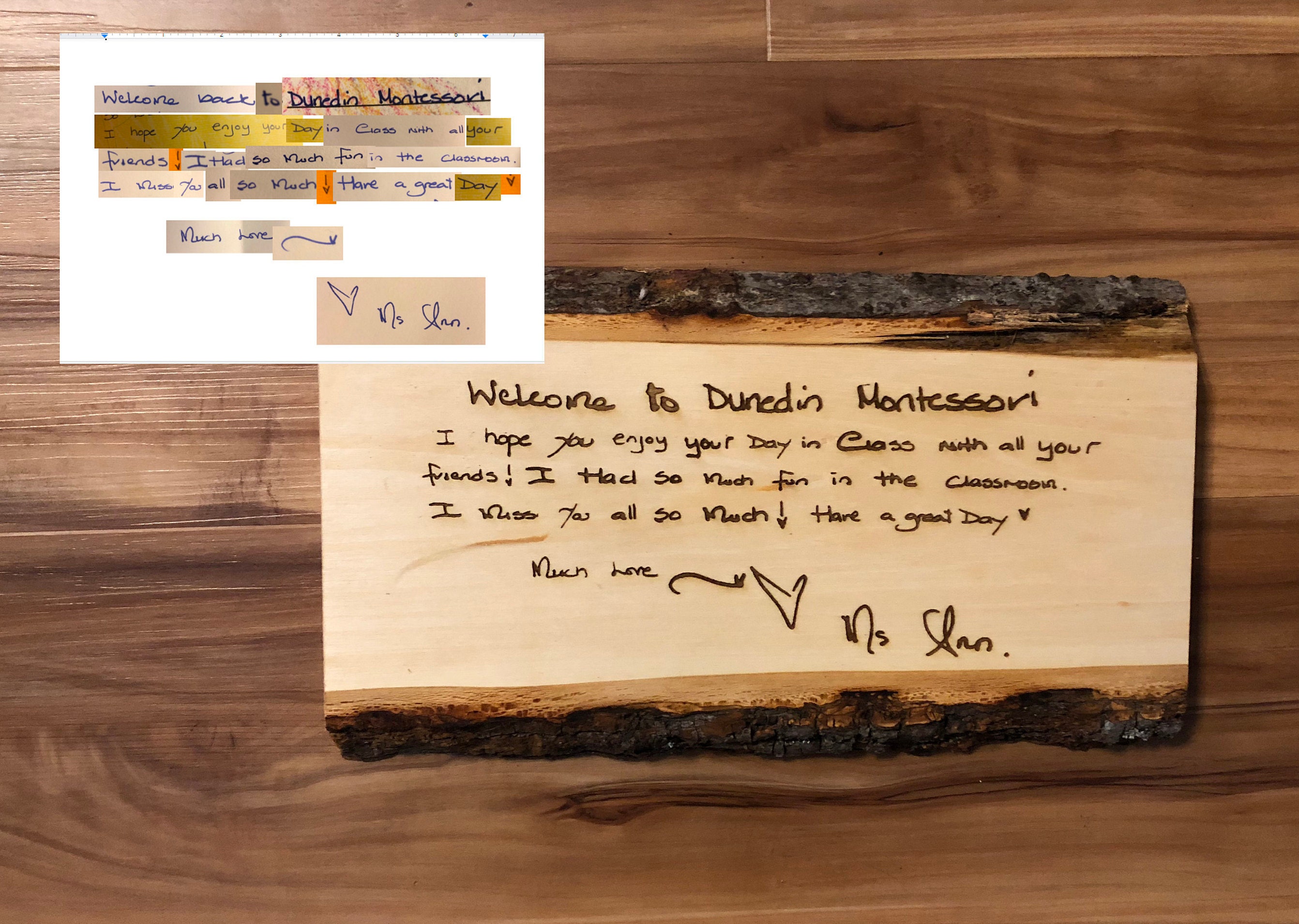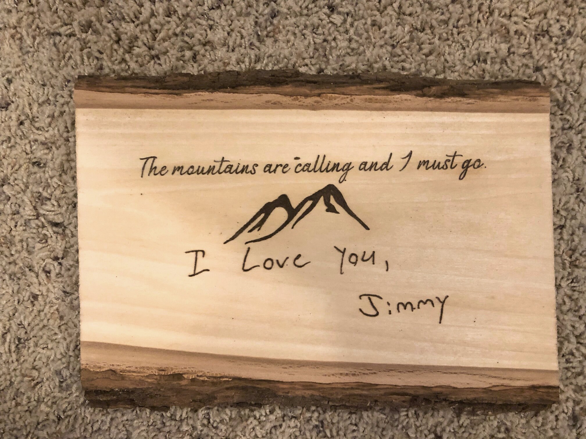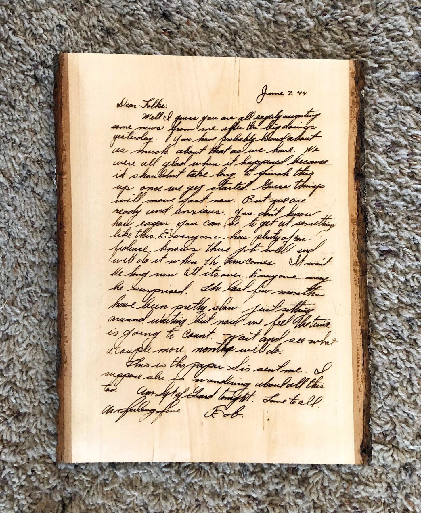 Send me a digital file of the note or letter and I will burn the letter into the wood in the exact handwriting!