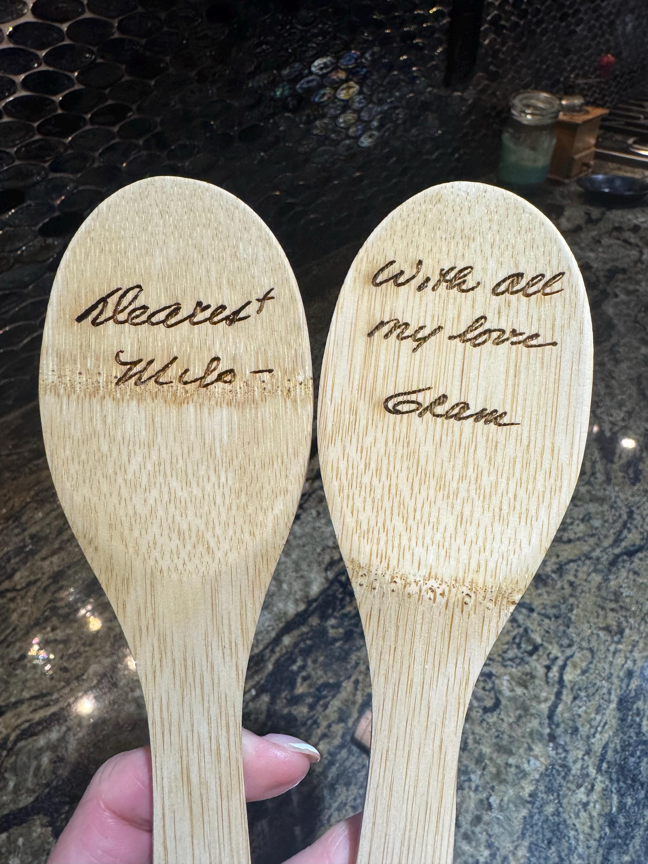 An engraved wooden spoon is the perfect addition or accessory to any kitchen! These spoons can be engraved with your last name, a monogram, a signature, a short saying, a drawing or anything else you would like! Available to order on its own or as an addition to another order at a discounted rate. Please indicate in the instructions if you intend to hang the spoon ensure the proper orientation of the writing.